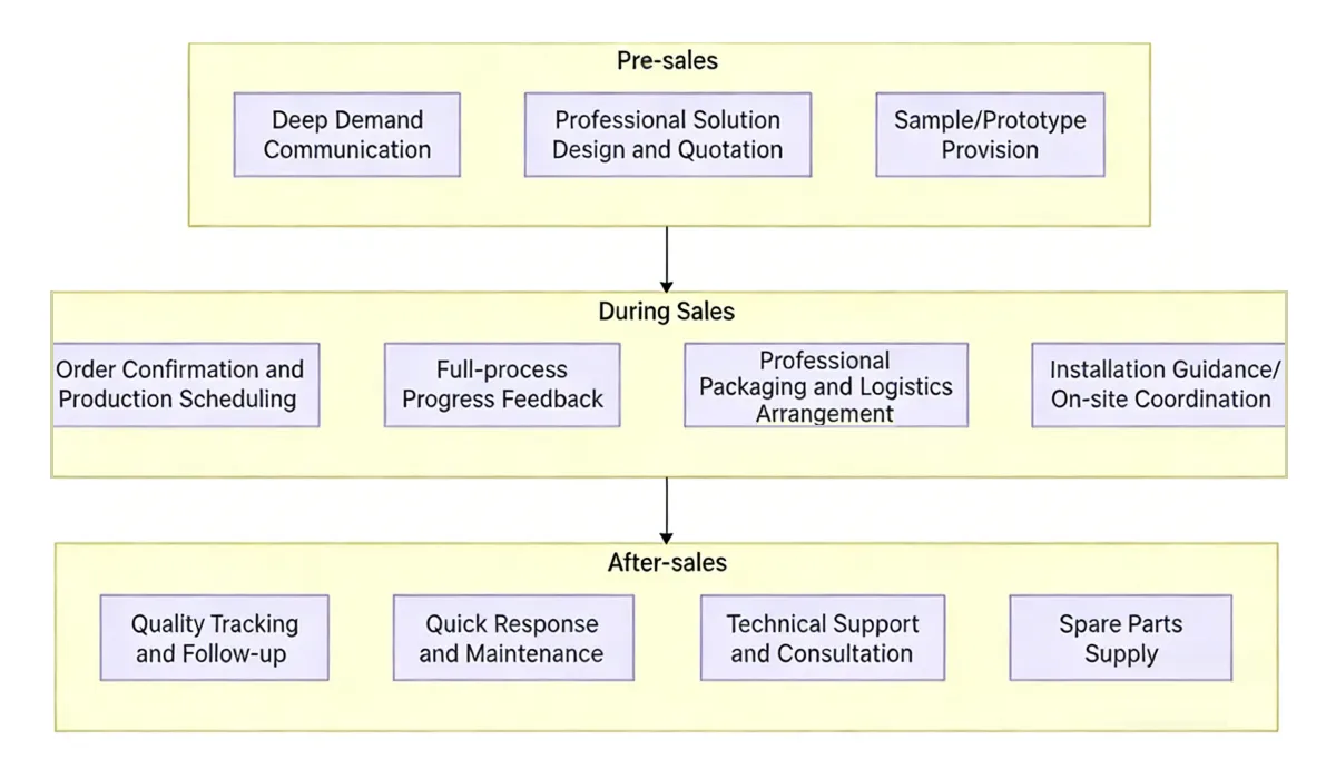 Pärast tellimuse kinnitamist käivitab YeHaoXuan spetsiaalse tootmisgraafiku, mis võimaldab teil edenemist reaalajas jälgida; pärast tootmist kasutame professionaalseid pakendeid ja usaldusväärset logistikat ning pakume paigaldusjuhiseid ja vajalikku kohapealset tuge, et tagada toote sujuv kohaletoimetamine.